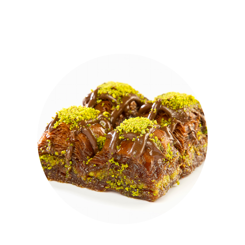 A Decadent Fusion: The Flaky Classic Meets Belgian Cocoa. Elevate the experience with our Chocolate Baklava. We layer the buttery phyllo with a blend of premium nuts and rich, high-quality cocoa powder, then finish it with a drizzle of luxurious dark chocolate ganache. This innovative piece captures both traditionalists and modern chocolate lovers.